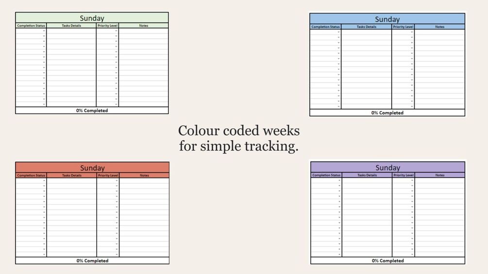 Stay organized with a simple and straightforward task tracker. Always know your progress with clear graphics and simple to read. Never lose track of any task with colour-coded weeks. This Excel spreadsheet allows you to track up to 4 weeks at a time and can be used over and over.